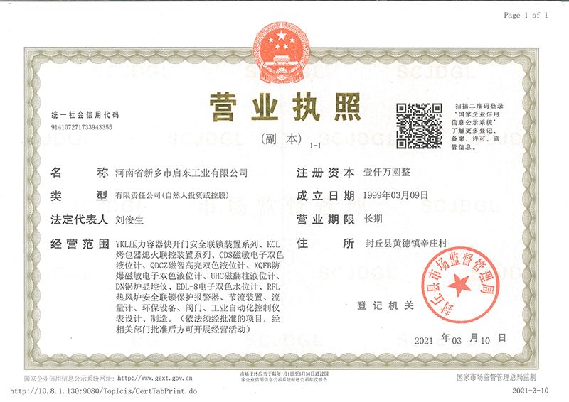 河南省新鄉(xiāng)市啟東工業(yè)有限公司始建于1987年,是專注研發(fā)、生產自動化儀器儀表(主要與壓力容器、鍋爐等容器配套使用)的廠家。主要產品有液位計(磁敏雙色型、磁翻柱型等)系列、烤包器熄火聯(lián)控裝置系列、壓力容器快開門安全聯(lián)鎖保護裝置系列、鍋爐報警器系列。二十多年來,公司產品暢銷國內并遠銷俄羅斯、蒙古與東南亞,深得廣大用戶的信賴和好評。我們多年來致力于自動化儀器儀表的研制生產,公司現具有完善的生產、試驗、檢測手段和設備。科技創(chuàng)新、誠信服務,是我們不變的經營理念,我們將以強有力的技術支持及售后竭誠為客戶提供良好的服務。  2012年我公司成功研發(fā)了KCL系列烤包器熄火聯(lián)控裝置,并于2013年2月2日榮獲中華人民共和國國家知識產權局辦法的《實用新型**證書》<**號:2021202257735>該產品廣泛應用于唐鋼等大型鋼鐵企業(yè),為烤包器安全作業(yè)提供了有力的保障。  2002年我公司成功研發(fā)磁敏電子雙色液位計獨特的高亮度LED紅綠雙色顯示,獲得了專家的首肯和用戶的一致好評。在此基礎上我公司研發(fā)人員十年磨一劍,致力于XQFB-1防爆型磁敏雙色液位計的研發(fā),于2013年12月27日由國家防爆電器產品質量監(jiān)督檢驗中心檢驗合格并頒發(fā)防爆合格證書<編號:cnex19.0883>。該產品性能得到了充分的發(fā)揮,廣泛應用于含有Ⅱ類A·B級T1-T4組可燃氣體或蒸汽與空氣混合形成的爆炸性混合物的0區(qū)、1區(qū)危險場所。連接用戶DCS或PLC系統(tǒng)實現遠距離集中顯示和控制,從而實現節(jié)能、數字化管理。為用戶增加了一定的經濟效益和社會效益,。2014年公司成功申請了夢潤儀表的logo,新的品牌新的形象,夢潤儀表是啟東的LOGO, 歡迎新老用戶前來洽談合作。  我們一如既往地注重科研的投入,憑借產品的不斷更新、加大科技含量,進一步拓展市場。我們相信品質成就未來,以過硬質量、優(yōu)惠價格、完善的售后服務熱忱歡迎廣大客戶來我司視察指導、洽談業(yè)務;精誠合作,共創(chuàng)輝煌!